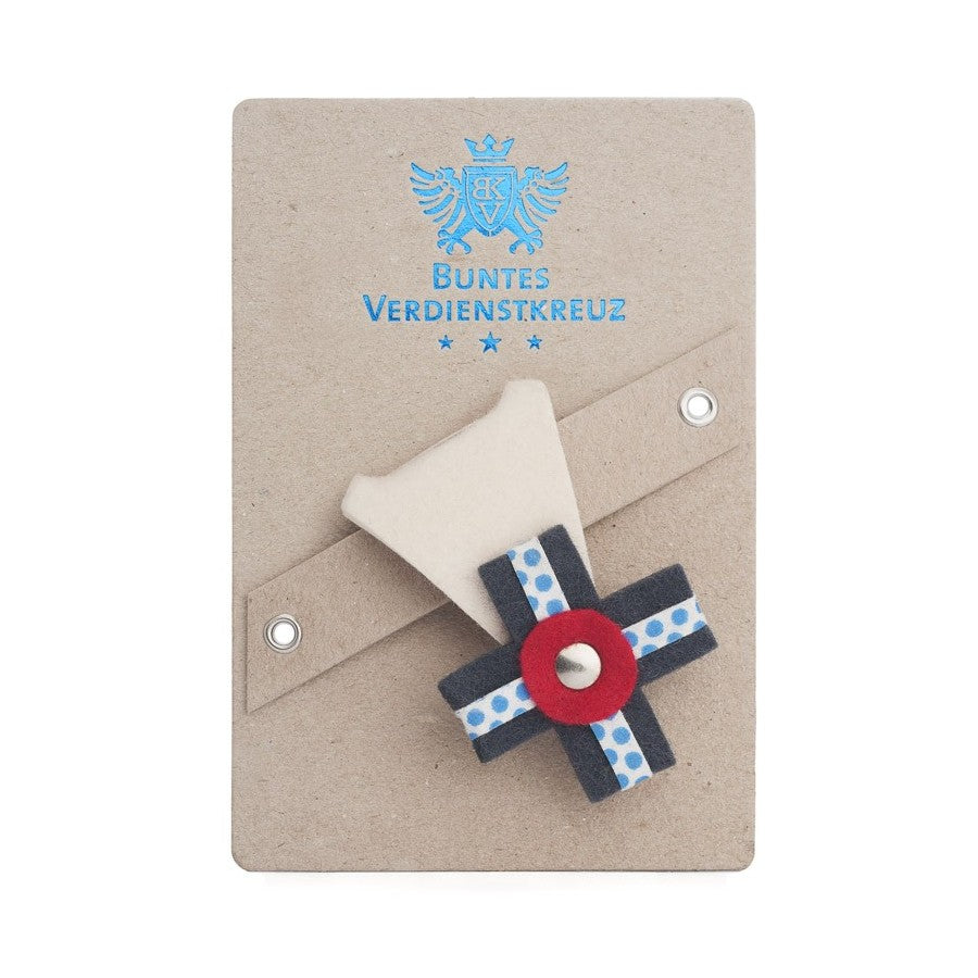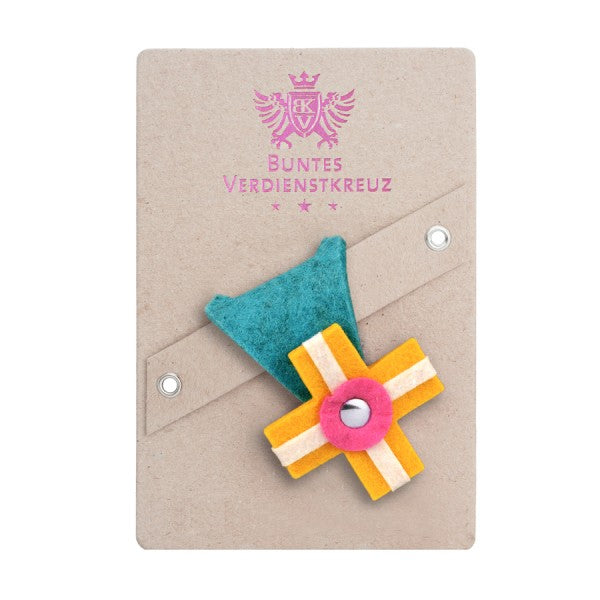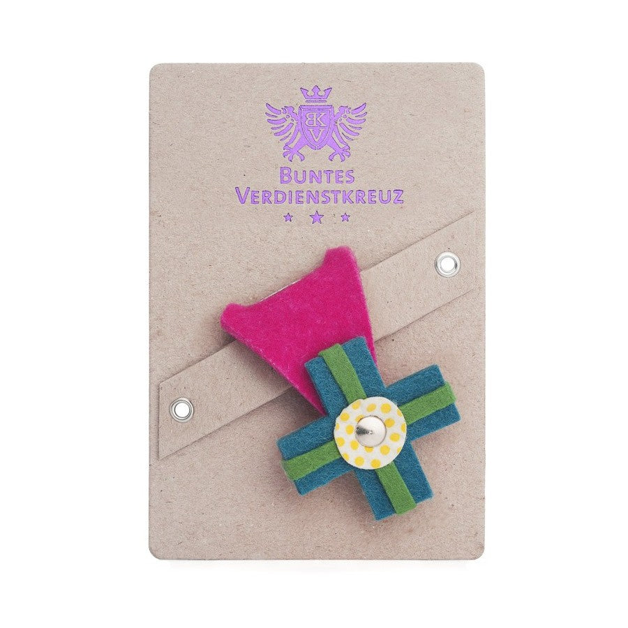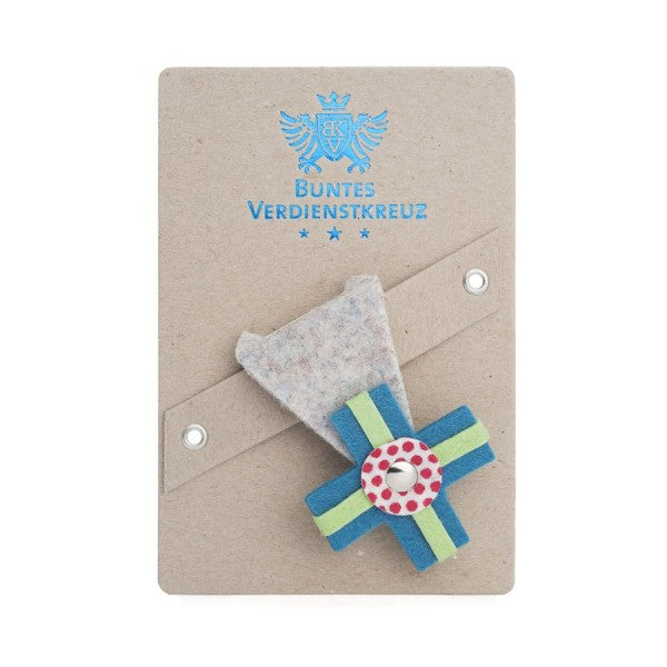 Schmücken Sie mit dem Bunten Verdienstkreuz die tollen Arbeitskollegen, die fleißigen Alltagshelfer, oder den Retter in der Not. Auf der Rückseite der kartonierten Halterung ist ein origineller Vordruck für Ihre persönliche Widmung eingeprägt.
