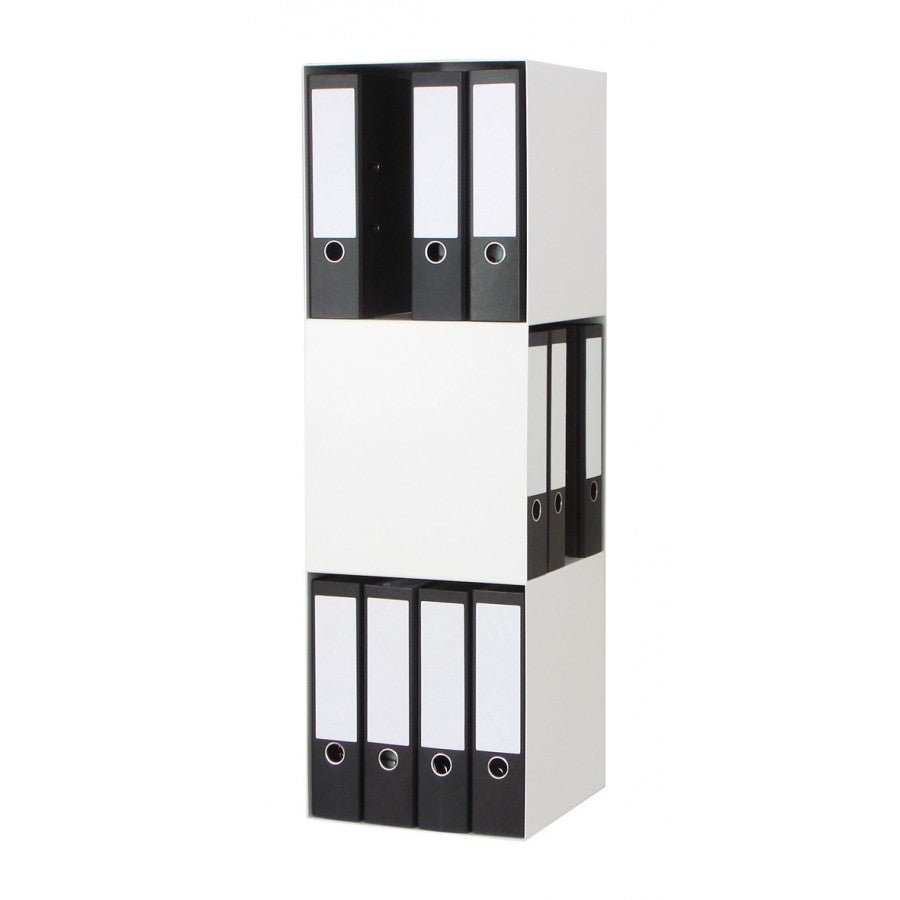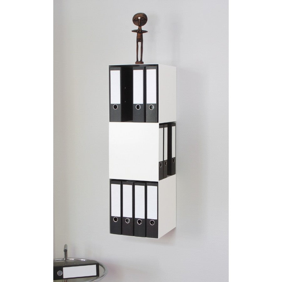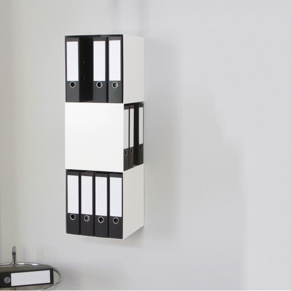 Wer sagt, dass Ordner immer in "Reih & Glied" stehen müssen? Mit dem um 90 Grad gedrehten Mittelteil des 2side Ordnerregals entsteht ein modernes Büroobjekt das in jedes Office passt. Anstelle meterlanger Aktenreihen bietet das Regal durch seine kompakte Form Platz für 12 breite Aktenordner und setzt damit ein klares Design Statement für eine unkonventionelle Lösung.